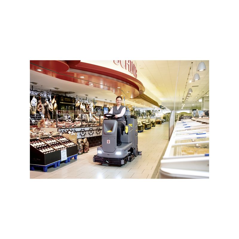 Ideal para superficies con ángulos: nuestra fregadora-aspiradora con conductor sentado B 110 R. Con cabezal de cepillos circulares con 75 centímetros de ancho útil, cargador integrado y 110 litros de capacidad del depósito.Gracias a su cargador integrado, la fregadora-aspiradora con conductor sentado a batería B 110 R se puede cargar sin problemas en diferentes ubicaciones con acceso a fuentes de corriente externas. Con 2 cepillos circulares, 75 centímetros de ancho útil y su diseño especialmente esbelto y compacto, este equipo maniobrable y ágil es especialmente adecuado para limpiar también superficies con muchos ángulos. Se puede manejar fácilmente con el interruptor EASY Operation, los elementos de control codificados por colores y la pantalla a color para efectuar todos los ajustes importantes en 30 idiomas. Todo esto se complementa con el innovador sistema de llaves KIK, que evita además en gran medida los errores de manejo. El depósito de agua limpia de 110 litros se llena en poco tiempo con la función Auto Fill, mientras que la dosificación del agua en función de la velocidad permite mantener un consumo reducido en todo momento. El usuario también se beneficia del cómodo asiento con altura regulable y de la luz de marcha diurna, que aumentan la seguridad pasiva.