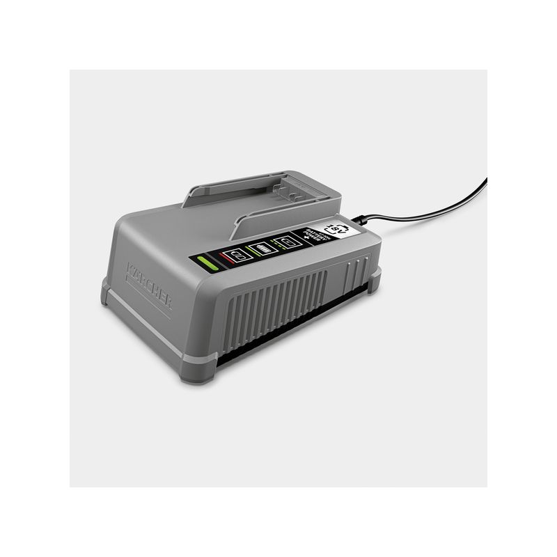 Cargador rápido para todas las baterías de litio Kärcher Battery Power- y Kärcher Battery Power+ de 18 V. Corriente de carga de 6 A. Con indicación LED de estado de servicio. Bajo consumo en standby. Montaje en la pared.