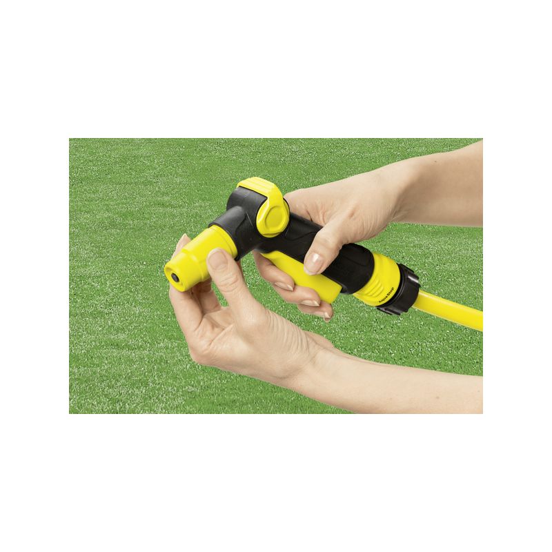 La pistola de riego ideal para la iniciación. Con mecanismo de disparo bloqueable para regar cómodamente el jardín. Con conexión rápida y fácil a la manguera de riego.Con la pistola de riego se puede regar el jardín de forma especialmente cómoda. Gracias al mecanismo de disparo bloqueable con función de fijación puede mantenerse un caudal permanente de agua en la boquilla de riego, sin tener que presionar de forma continuada. Además, mediante la válvula de control que se puede manejar con una mano, el caudal de agua se puede adaptar según necesidad. La pistola de riego cuenta con dos patrones de pulverización: el chorro concentrado y el de cono. Estos se pueden ajustar de forma gradual según necesidad. De este modo, no solo se pueden regar fácilmente huertos florales y de plantas, sino que también se puede eliminar la suciedad gruesa de terrazas o muebles de jardín con el chorro concentrado. Por eso, la pistola de riego es perfecta tanto para tareas de riego como de limpieza. A propósito, las boquillas de Kärcher son compatibles con todos los sistemasClick disponibles y se pueden conectar a su manguera de riego sin problemas.