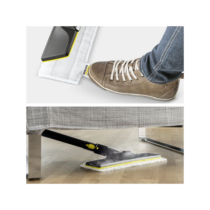 La boquilla para suelos EasyFix para limpiadoras de vapor incluye un paño para suelos de microfibra adaptado y ofrece unos resultados de limpieza excelentes en suelos duros, incluso en rincones y bordes. El ingenioso sistema de velcro permite fijar de manera sencilla y rápida el paño para suelos de microfibra a la boquilla para suelos: basta con presionar el paño en la boquilla para suelos EasyFix y listo. Después de limpiar, el paño para suelos de microfibra se puede quitar de la boquilla para suelos EasyFix sin tocar la suciedad: para ello, basta con pisar la lengüeta a la que está fijado el paño y levantar la boquilla para suelos.