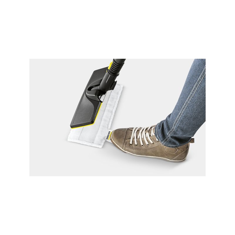 Cambiar de la limpiadora de vapor manual a la fregadora de vapor 2 en 1 en cuestión de segundos: el práctico kit de limpieza para suelos EasyFix para el SC 1 lo hace posible. Tan solo hay que fijar el paño para suelos de microfibra con el sistema de velcro a la boquilla para suelos EasyFix y conectar la boquilla con ambos tubos de prolongación (de 0,5 m cada uno) al SC 1. Y ya está: que empiece la limpieza a fondo de los suelos duros. El kit de limpieza para suelos EasyFix está incluido en el suministro estándar del SC 1 EasyFix.