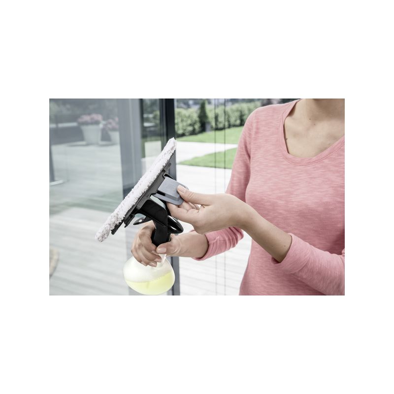 Gracias al sistema con cintas de sujeción, el paño de microfibra puede cambiarse y fijarse con total facilidad a la botella pulverizadora. Dado que contiene muchas fibras abrasivas, la esponja es apropiada sobre todo para la limpieza de las ventanas exteriores. El rascador de suciedad incluido permite eliminar incluso la suciedad más resistente de los cristales de las ventanas.