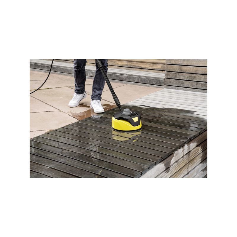 El brazo de rotación Twin Jet de la limpiadora de superficies T 5 T-Racer permite retirar la suciedad de una gran superficie y, por tanto, la limpieza rápida y eficiente de grandes superficies exteriores. Especialmente práctica: La limpiadora de superficies ofrece la posibilidad de adaptar individualmente la distancia de las toberas respecto a la superficie de limpieza. De esta forma se pueden limpiar superficies duras, como piedra u hormigón, y superficies sensibles, como la madera, de forma adaptada a las necesidades. En comparación con la limpieza mediante lanza pulverizadora, con la T 5 T-Racer se puede ahorra aproximadamente la mitad del tiempo. Además, la cubierta protege de las salpicaduras al usuario y el entorno de forma fiable y el llamado efecto aerodeslizador hace que maniobrar resulte muy fácil. Con ayuda del asa ergonómica también se pueden limpiar de forma óptima superficies verticales, como puertas de garaje. Adecuada para limpiadoras de alta presión de las gamas K 2 a K 7.