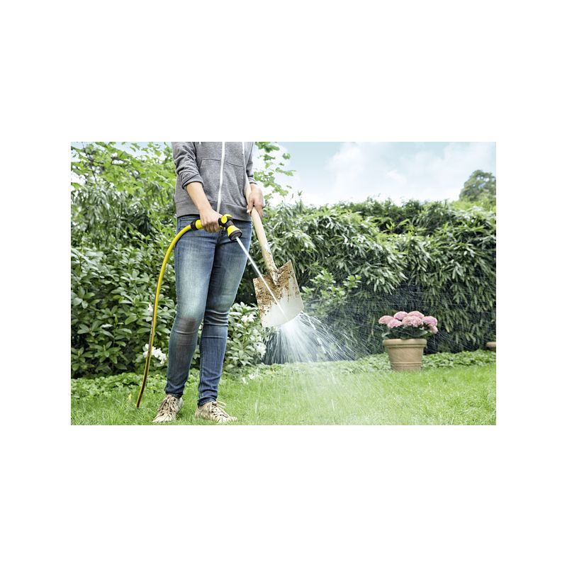 La pistola de riego multiuso sencilla cuenta con 3 patrones de pulverización: aspersor, chorro concentrado y chorro de cono. Gracias a su pulsador bloqueable es ideal para regar permanentemente plantas diversas.La pistola de riego multiuso es especialmente adecuada para regar diversas plantas con diferentes necesidades. Por último, la pistola de riego multiuso dispone de 3 patrones de pulverización: aspersor, chorro concentrado y chorro de cono. No solo se pueden regar fácilmente los bancales de plantas y flores (aspersor y chorro de cono), sino que también se puede limpiar la suciedad más gruesa de las terrazas y muebles de jardín (chorro concentrado). Así, esta pistola de riego multiuso es ideal tanto para tareas de riego como para tareas de limpieza. Además, la pistola de riego cuenta con un pulsador bloqueable en la empuñadura, que permite un manejo sencillo y un caudal de agua permanente. Además, la válvula de control ergonómica y manejable con una mano permite adaptar la cantidad de agua según las necesidades. Por cierto, las boquillas de Kärcher con compatibles con todos los sistemas Click disponibles y se pueden conectar fácilmente a su manguera de riego.