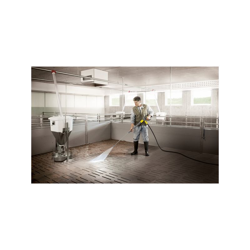 La limpiadora de alta presión con agua fría HD 10/25-4 SX Plus tiene un modo de construcción vertical y convence con su pistola de alta presión EASY!Force, el mando por interruptor de presión y Servo Control.La limpiadora de alta presión con agua fría HD 10/25-4 SX Plus con accionamiento trifásico convence por su comodidad de uso y por su extraordinaria potencia de 250 bar con un volumen de caudal máximo de 1000 l/h. Gracias a su modo de construcción vertical, el equipo ocupa menos espacio que los equipos convencionales y es más maniobrable, especialmente en caso de obstáculos. También ayudan sus grandes ruedas con neumáticos de caucho que la hacen fácil de transportar incluso por terrenos impracticables. En el compartimento separado para boquillas se pueden guardar de forma segura los accesorios que no se utilicen en cada momento. Las nuevas innovaciones garantizan un trabajo sin cansancio y un montaje y desmontaje rápidos: Mientras que la pistola de alta presión EASY!Force aprovecha la fuerza de retroceso del chorro de alta presión para reducir a cero la fuerza de retención, los cierres rápidos EASY!Lock permiten un manejo cinco veces más rápido que las conexiones por rosca convencionales sin repercutir negativamente en la robustez y la larga vida útil. El equipo ha sido concebido para el uso diario en condiciones difíciles. La culata de latón resistente al detergente y los émbolos de acero inoxidable con manguitos cerámicos garantizan una larga vida útil.