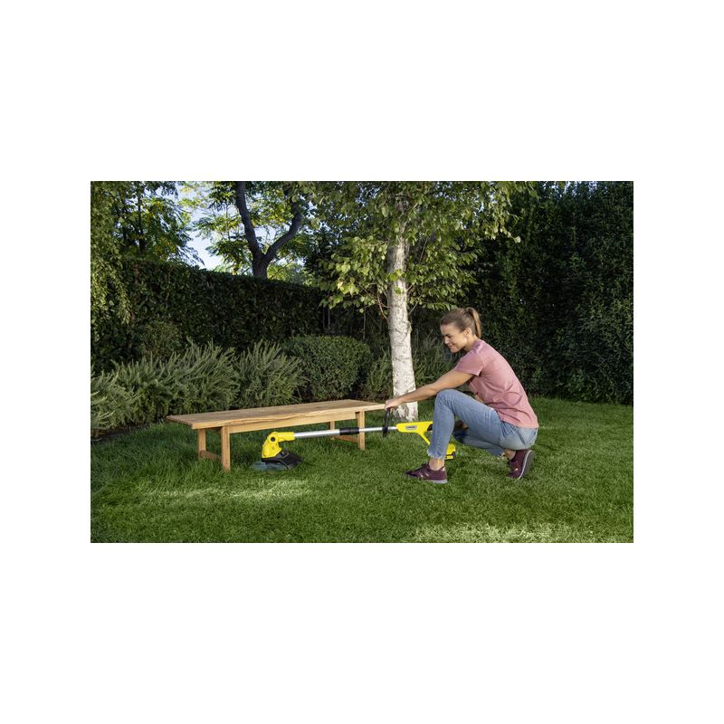 Todos los jardines tienen rincones ingratos a los que es difícil llegar con el cortacésped o que presentan obstáculos, como un muro adyacente o un arbusto. Para trabajar en estos rincones sinuosos hace falta un equipo pequeño, flexible y, por supuesto, potente: una podadora de Kärcher. Esta contiene un hilo de corte girado que se reajusta constantemente mediante la alimentación automática del hilo en el carrete. Así, el hilo siempre tiene la longitud perfecta en cada corte y se garantizan unos resultados de corte limpios. Resulta especialmente agradable que el trabajo es muy silencioso y el carrete de hilo se puede cambiar con solo unas pocas operaciones y sin necesidad de herramientas. Y ya se puede seguir en busca de la última brizna de hierba.