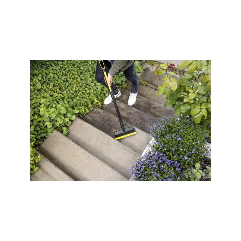 La potente escoba de exterior PS 30 proporciona unos resultados de limpieza brillantes en las superficies más diversas. De ello se encargan tres boquillas de alta presión que eliminan la suciedad incrustada. La PS 30 es el ayudante ideal a la hora de realizar una limpieza fiable de superficies pequeñas y medianas, al igual que para escaleras y esquinas. El cabezal de cepillos gira 360° para llegar a lugares de difícil acceso. Todas las superficies lisas se pueden secar después de la limpieza con el labio para suciedad integrado. De esta forma se eliminan rápidamente los restos de agua sucia y las superficies vuelven a estar listas para ser utilizadas. Esta combinación de chorro a alta presión y presión manual del cepillo arrincona con su poder de limpieza a todas los cepillos convencionales y se puede combinar con todas las limpiadoras de alta presión de Kärcher de las clases K 2 a K 7.