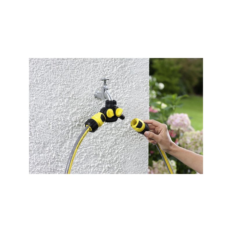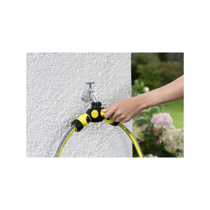 Distribuidor de dos vías con dos conectores de agua regulables individualmente. Ideal para conectar dos mangueras en un único grifo de agua (conexión de grifos G3/4, elemento reductor G1/2).Distribuidor de dos vías de alta calidad con conexión de grifo G3/4 y reductor G1/2 para el riego con hasta dos mangueras simultáneamente. El distribuidor de dos vías dispone de dos conexiones de grifo con dos reguladores sin escalonamientos independientes entre sí y destaca por un caudal de agua optimizado. Es de uso universal en combinación con todas las mangueras de riego habituales y destaca por su calidad robusta y su diseño ergonómico que permite un manejo cómodo y sencillo. La tuerca racor suave con rosca interior resistente garantiza una fijación fácil y cómoda al grifo de agua. El distribuidor de dos vías es compatible con la mayoría de los sistemas Click disponibles.